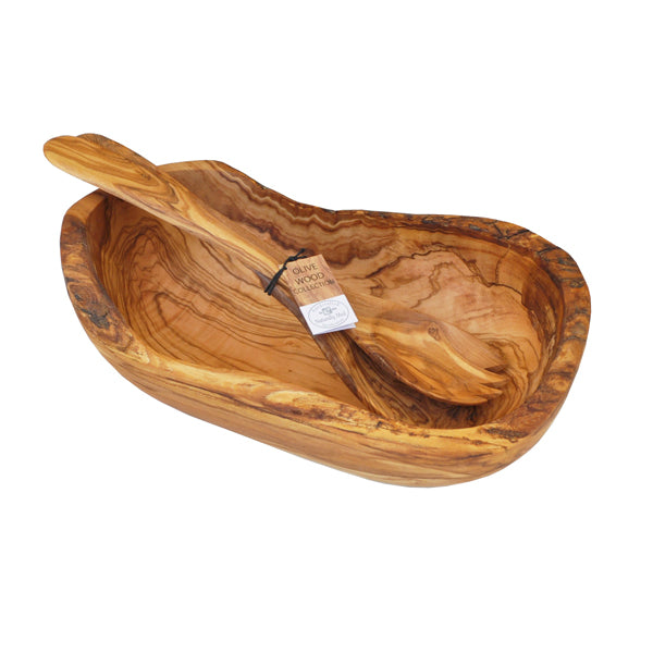 A stunning gift set of a natural boat shaped salad bowl and matching olive wood salad servers. Makes a great gift. The natural olive wood salad bowl is made from the branch of an olive tree. Each bowl is handcrafted and is totally unique. The bowl measures 12.5″ long approximately, and the olive wood salad servers measure 12″ long.